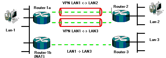 Mocht de verbinding tussen router 1b en 3 zonder NAT plaatsvinden, dan moet in router 3 een statische routering worden gemaakt naar LAN-2 via router-1b als het een transparante verbinding is (bijvoorbeeld een LAN-LAN verbinding tussen twee ISDN-routers), of als het ook weer een VPN is tussen twee ZyWall's dan moet er een VPN tunnel profiel worden aangemaakt met de gegevens van LAN-2 en LAN-3.